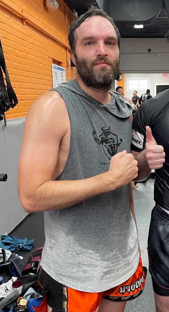 Suddenly, I went from being under stimulated to having mountains of new information to take in. Not only was I learning new things in every class, but I was constantly watching YouTube videos and reading books about muay Thai and fighting. The more I learned, the more I realized I didn’t know. I was enjoying being around my fellow students, picking up on strategy and technique and soaking up general gym culture. I didn’t aspire to be anything more than a Weekend Warrior, but I was happy to experience on a micro scale what it’s like to be a fighter, without actually getting in a ring with someone whose sole objective is to injure me to the point that I’m lying unconscious on the canvas. Sure, there was the occasional guy who came in to exercise his desk job demons by trying to flatline those of us just wanting to get in a fun workout, but they were few and far between. The gym was chill and the vibes were good. I had found my tribe. While my actual skills were improving incredibly slowly due to my complete lack of natural athletic ability, it was enough for me to stay engaged and committed. That’s not to say I never got discouraged at my slow progress, but since I wasn’t planning on ever competing, I was quick to adopt the mantra that you don’t need to be good at something to enjoy it.